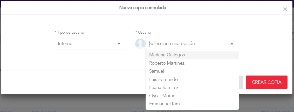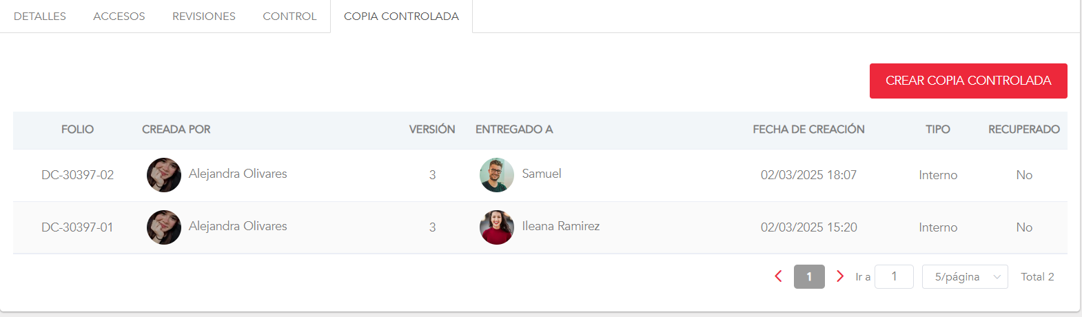 La sección «Copia Controlada» muestra un registro de las copias generadas de un documento, asegurando un seguimiento preciso de su distribución. El administrador general, administrador de cuenta y administrador de documentos pueden crear copias controladas de un documento y asignarlas a usuarios específicos.