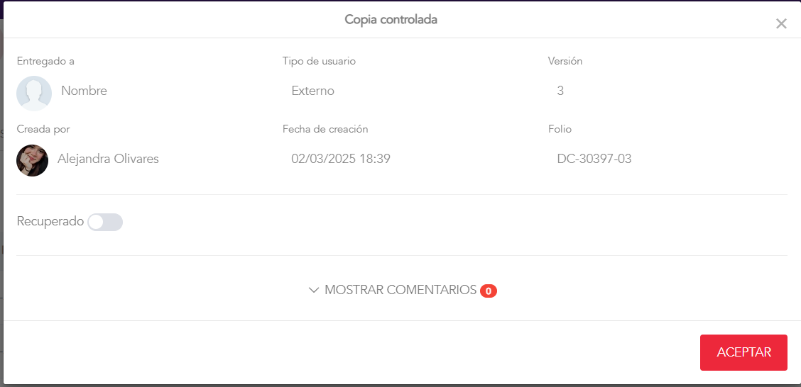 - Comentarios: Espacio para agregar o ver comentarios relacionados con la copia controlada.