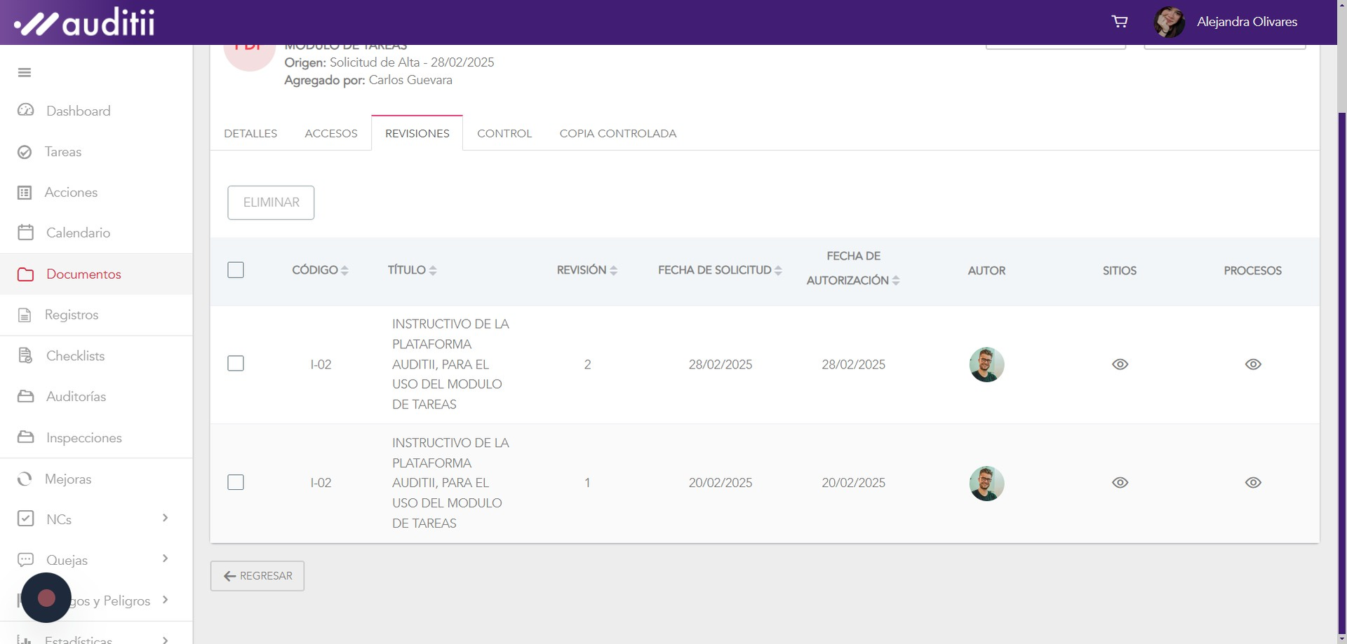 - Una vez terminada la creación del documento podrás “Guardar” y se añadirá a la lista de revisiones en orden.