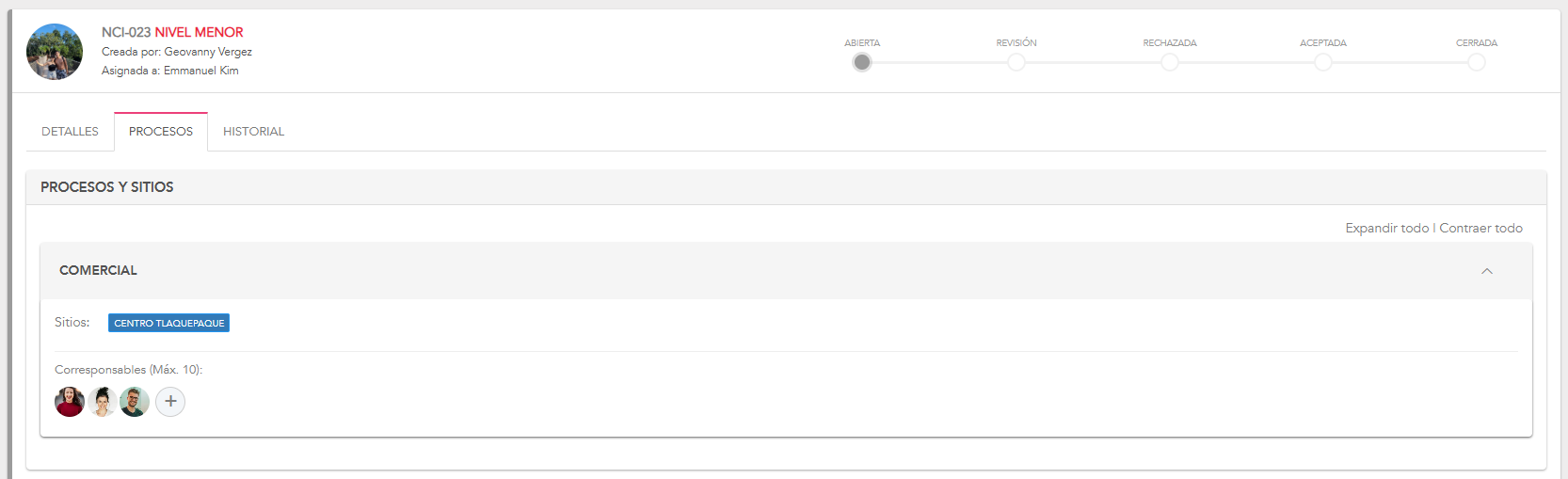 - Cuando la queja o no conformidad esté en estatus «Abierta», como responsable, podrás asignar máximo a 10 corresponsables por proceso desde la pestaña Procesos.
