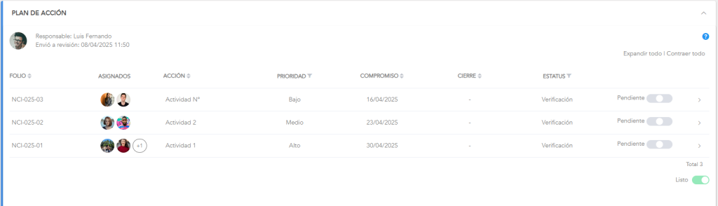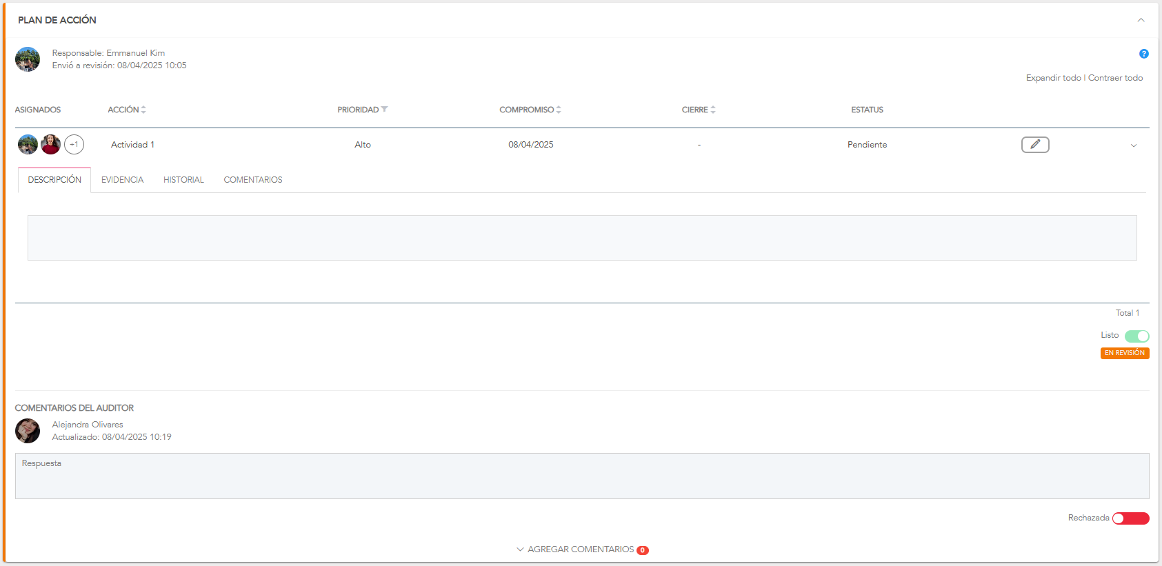 - Una vez que el auditor apruebe todas las secciones, los corresponsables deben completar las actividades del Plan de acción y enviarlas a revisión.