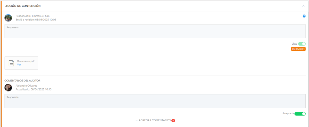 - Aceptada: Se alcanza cuando el auditor aprueba todas las acciones registradas.