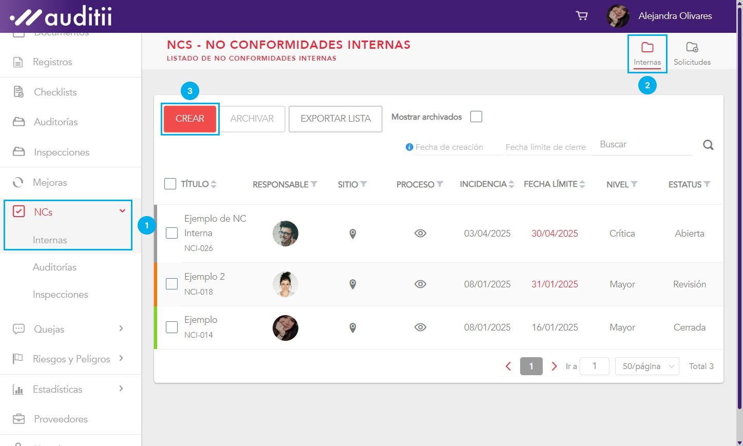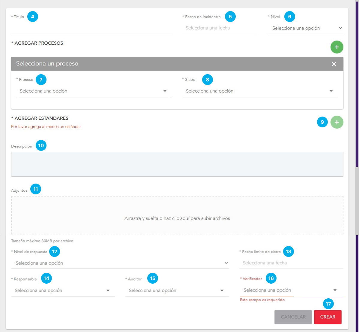 - Haz clic en «CREAR» 17 para registrar la no conformidad en la plataforma