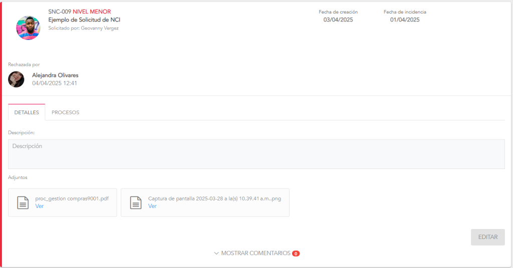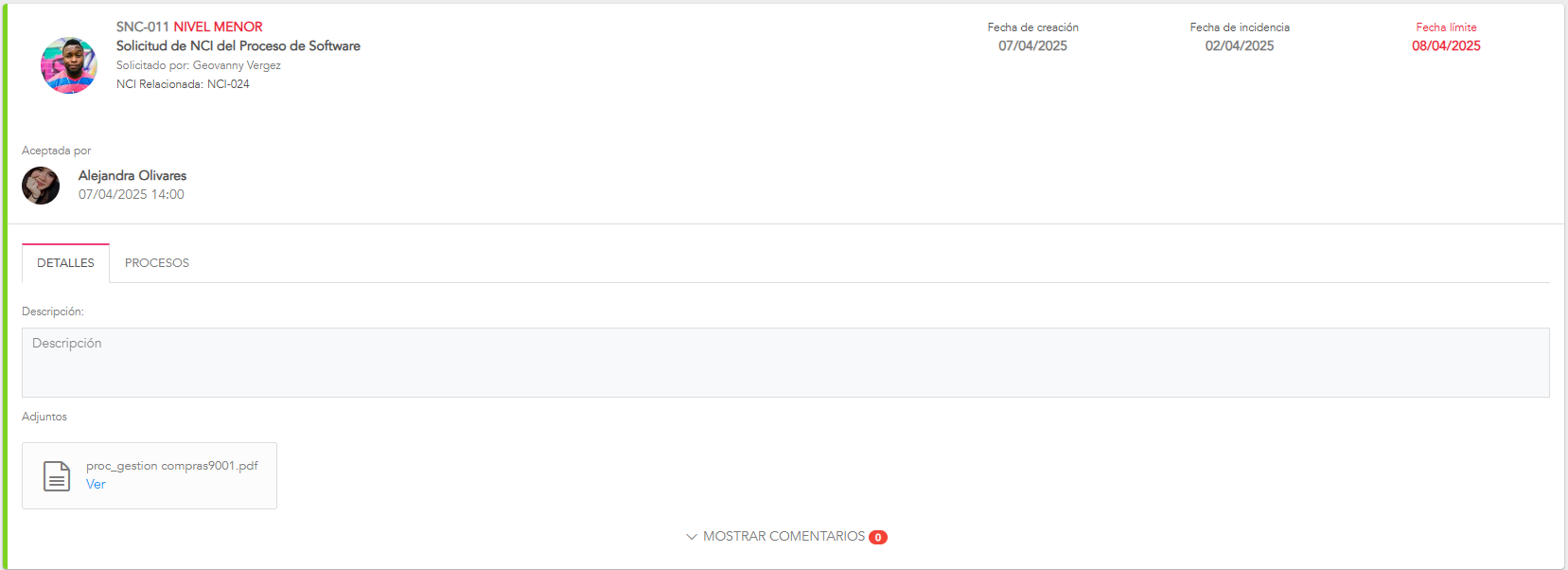 Si la solicitud es aprobada, la plataforma genera una nueva no conformidad interna relacionada con la solicitud. A partir de este momento, se puede continuar con el seguimiento de cierre de una queja o no conformidad según el flujo correspondiente.