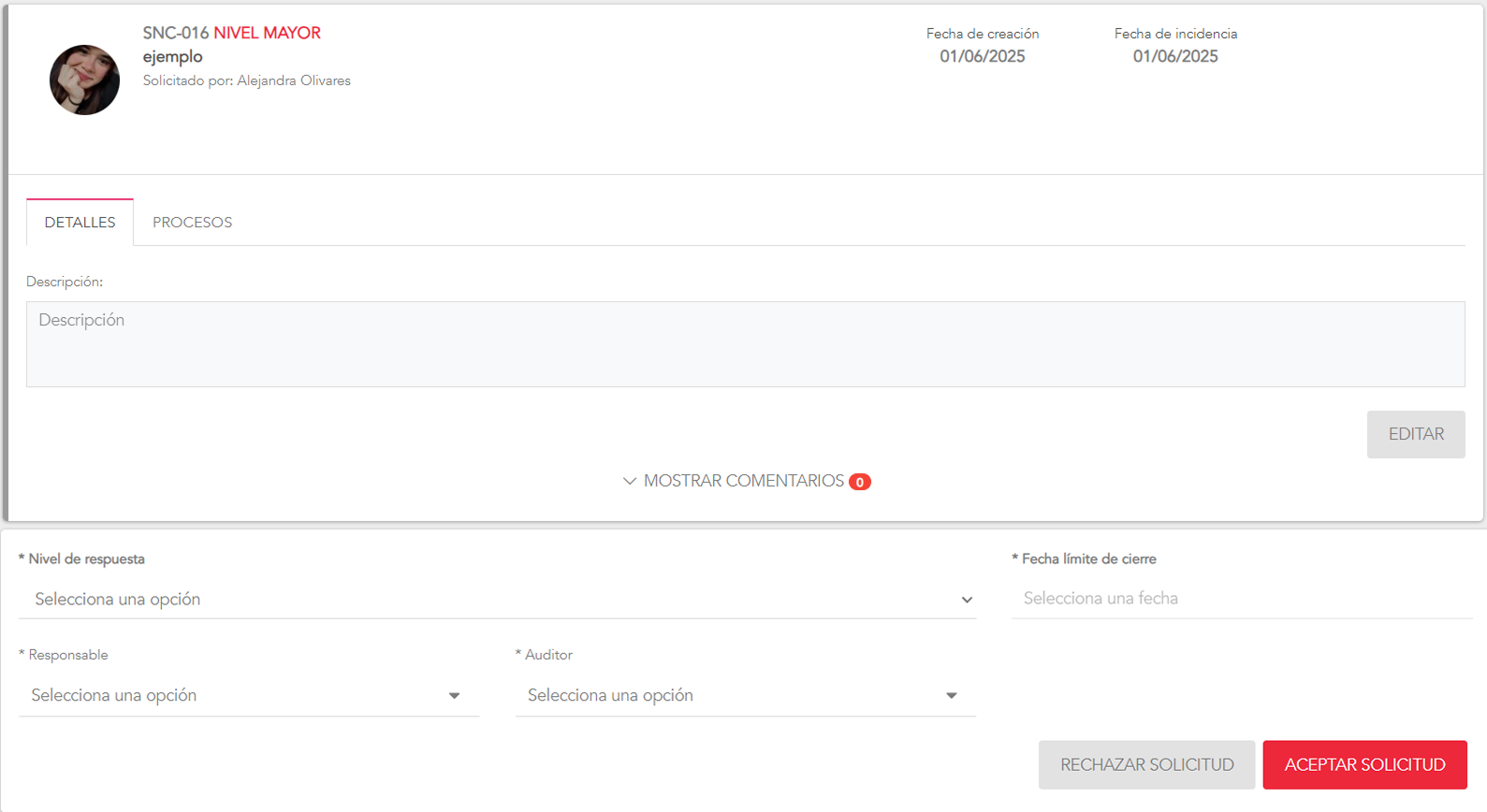 - Verificador: Campo que se activa únicamente si seleccionas el nivel de respuesta más alto. Este perfil valida el cumplimiento de las acciones implementadas.