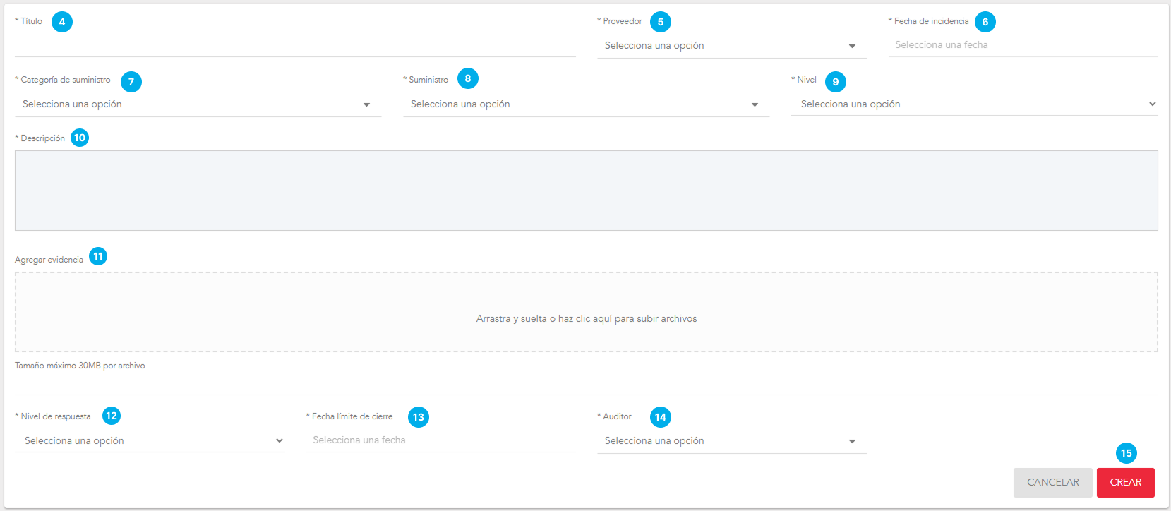 - Proveedor: 5 Selecciona el nombre del proveedor correspondiente.