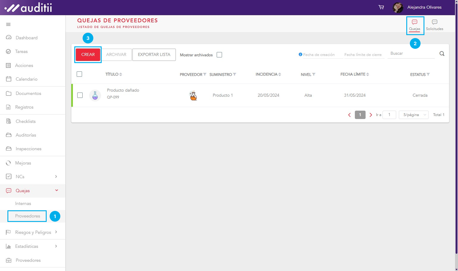- Una vez dentro, selecciona el módulo de «Quejas» en el menú lateral izquierdo para expandirlo y luego haz clic en la opción «Proveedores». 1