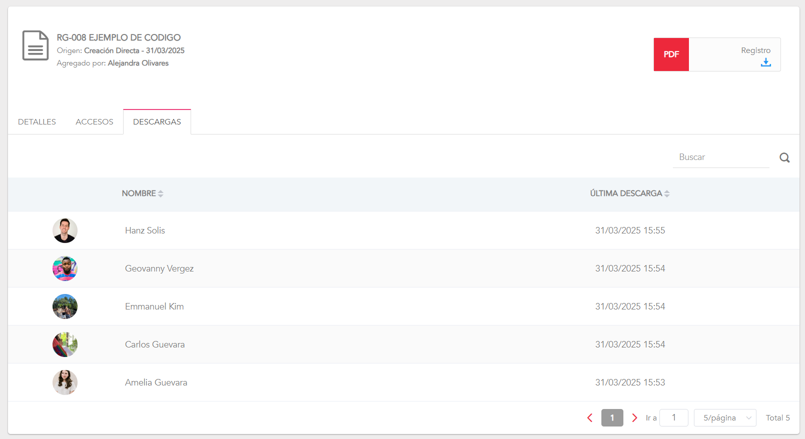 - Revisa el listado con el historial de las descargas realizadas sobre el registro.